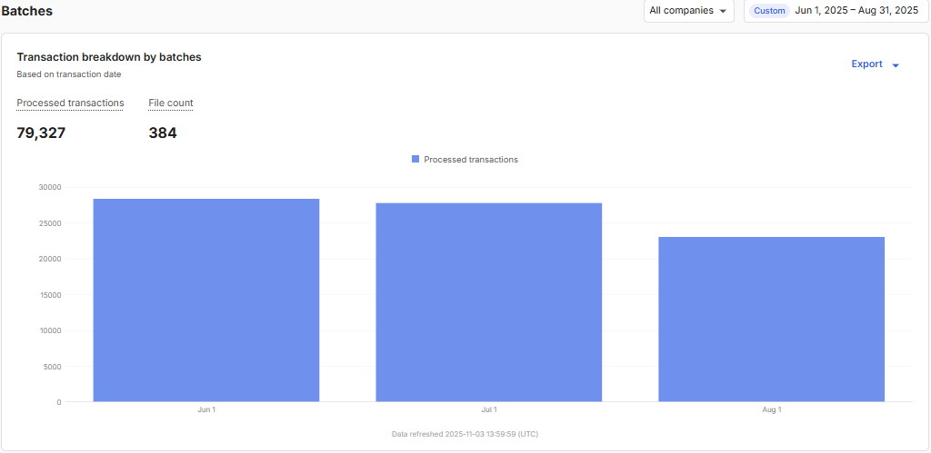 The chart displays the total number of processed transactions. This high-level view helps you verify that Revaly received and processed all expected files during the selected period.