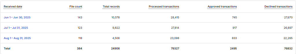 - Processed transactions, Approved transactions, and Declined transactions: Counts showing how each file performed after processing.
