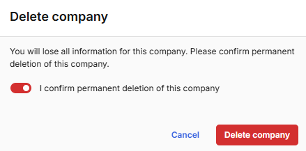 - In the confirmation screen, toggle the option "I confirm permanent deletion of this company", then click Delete Company.