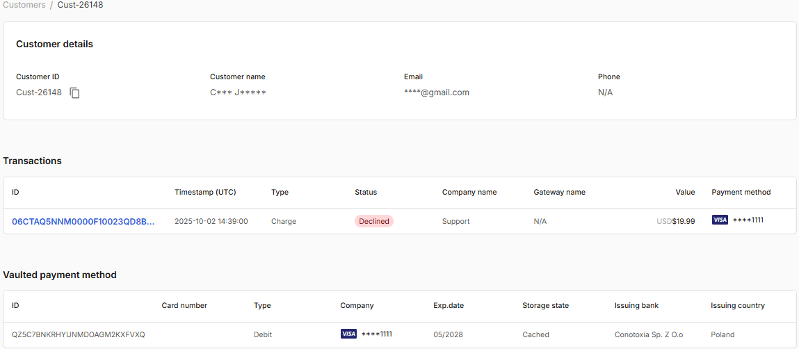 If transactions for this customer are processed using a tokenized payment method, the payment details are securely stored in Revaly’s vault. The stored token is used to retrieve the payment method information when processing future transactions.