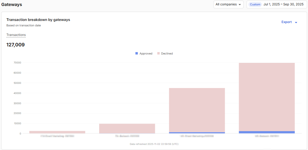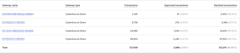 - Declined transactions: The number of declined transactions processed on that gateway.