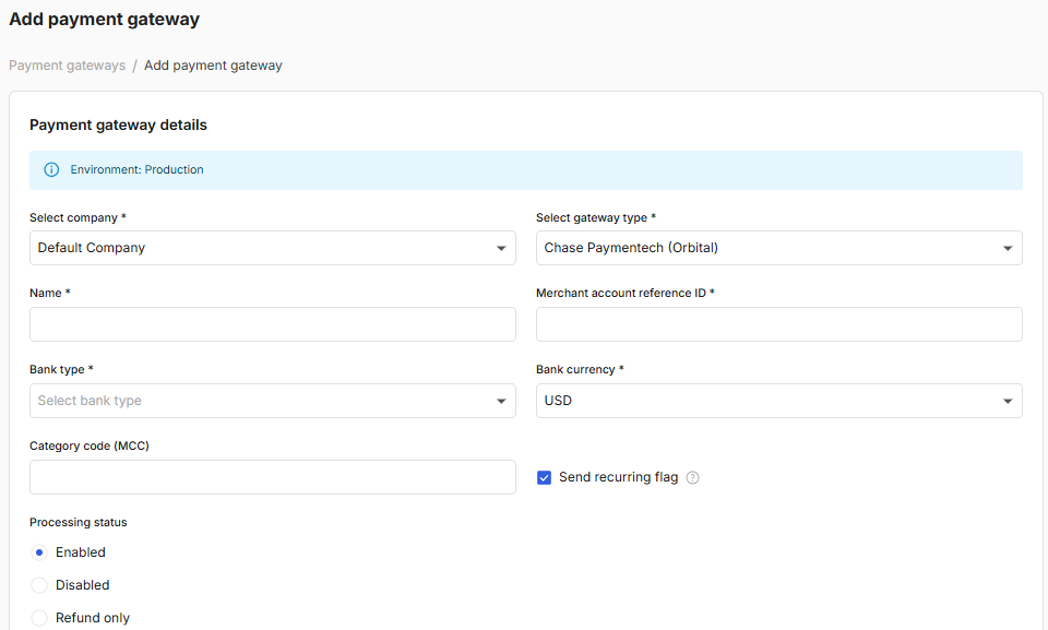- Processing Status: Enabled, Disabled, or Refund Only to stop all transaction processing on this gateway