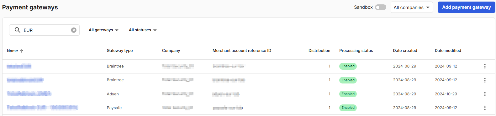 If the Sandbox toggle is enabled, the page displays only gateways configured for the sandbox environment.