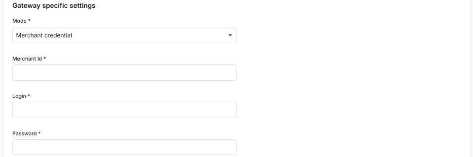 After selecting a Gateway Type, additional fields appear under Gateway Specific Settings. These settings vary by provider and may require credentials such as API keys, merchant IDs, or login information.