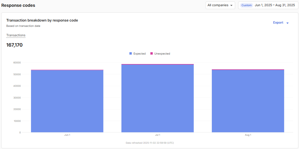The Response Codes report breaks down all received transactions by the Revaly response code, helping you identify the types of outcomes your transactions are producing.