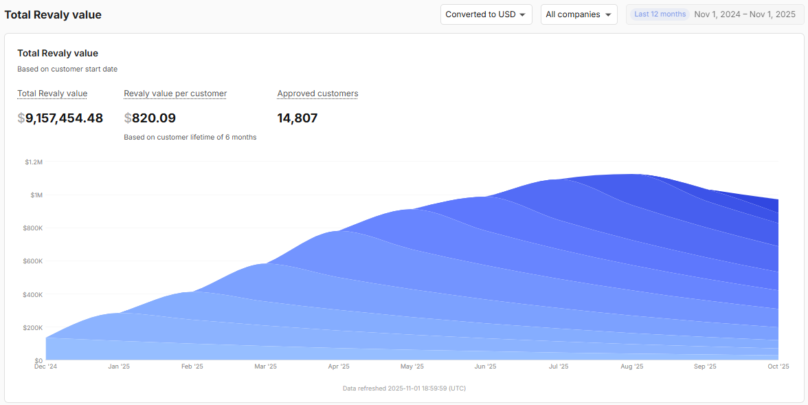 The area chart at the top of the page mirrors the one shown in the dashboard, displaying the estimated revenue contribution of approved customers over time.