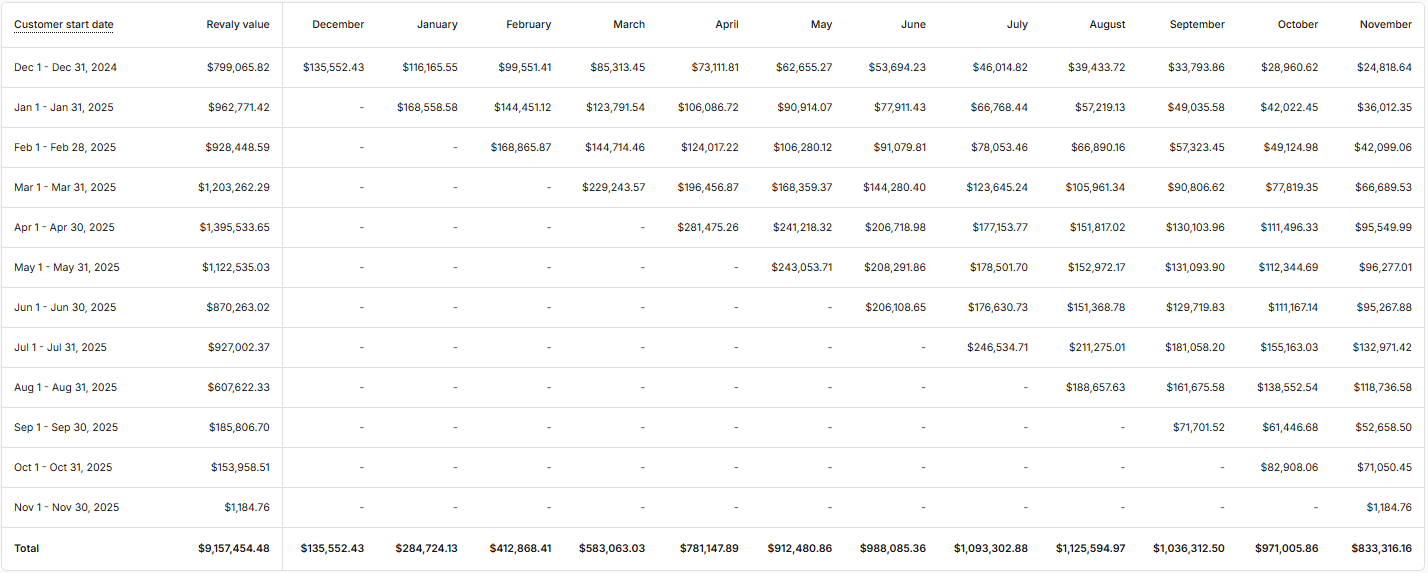 The Total Revaly Value report provides a comprehensive view of the revenue preserved and generated through Revaly’s payment performance optimization. It includes both realized value from recovered transactions and projected future value from retained customers across each cohort.