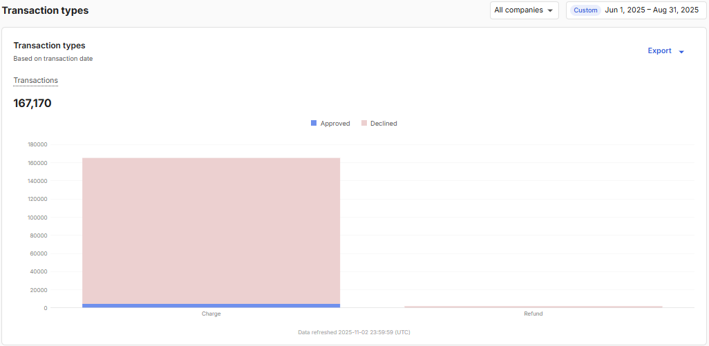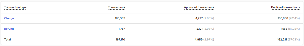 The chart displays the total number of transactions per type, with approved and declined counts shown side by side. This helps you quickly identify how each transaction category contributes to your overall volume.
