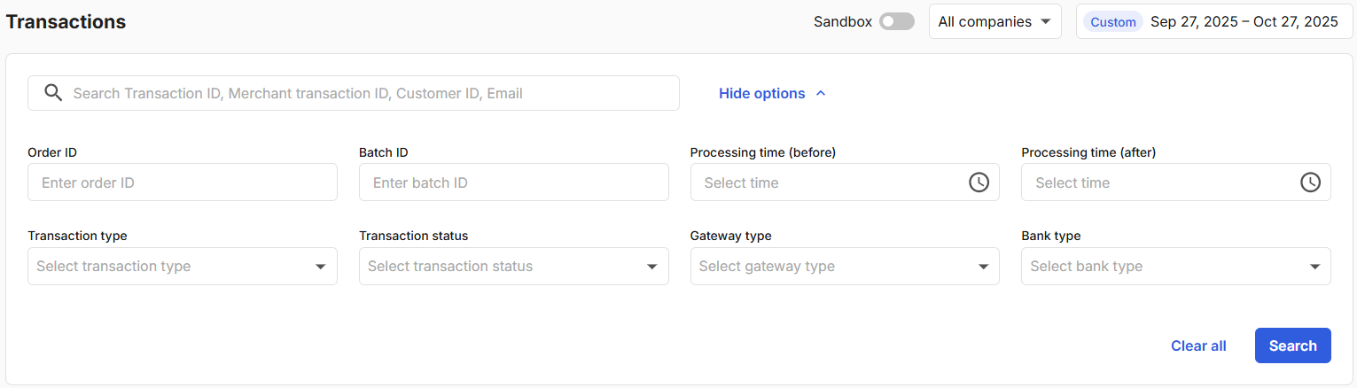 - Sandbox toggle: Enable this to view transactions processed in sandbox mode (test environment using sandbox API credentials).