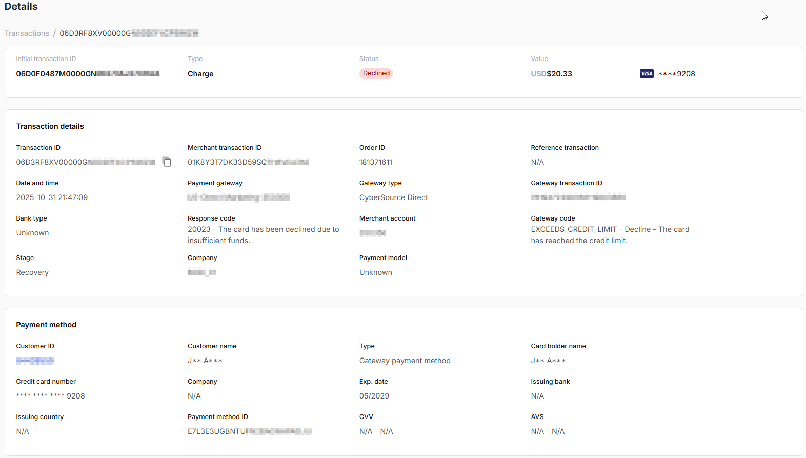 This section also includes the Initial Transaction ID, which identifies the first transaction associated with a payment. If a payment was retried multiple times, each attempt will have its own unique Transaction ID but share the same Initial Transaction ID, allowing you to trace all retries back to the original payment attempt.