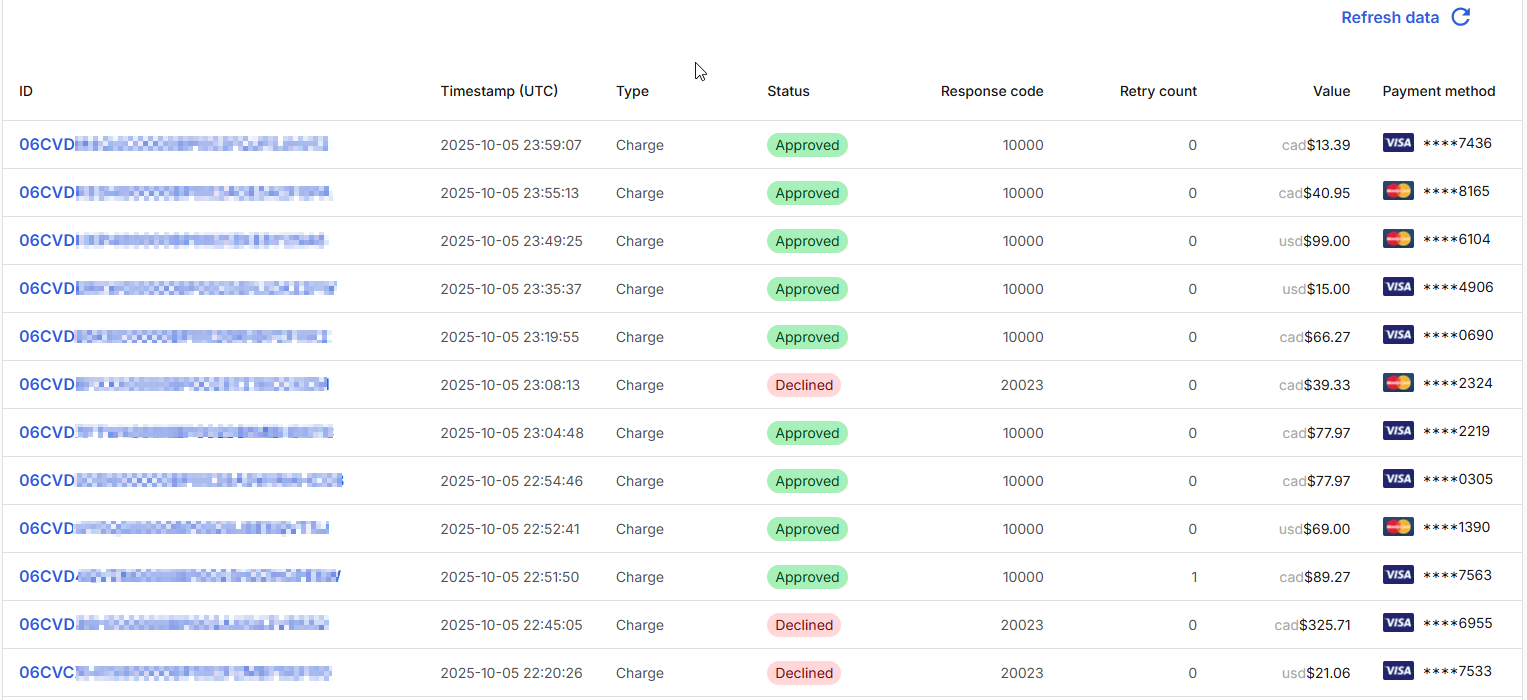- Search box: Enter a Transaction ID, Merchant Transaction ID, Customer ID, or Email to find specific transactions quickly.